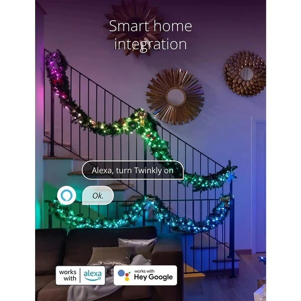 This Twinkly garland connects to home automation hubs like Amazon Echo, Google Nest Hub, and Apple HomeKit which allows for voice control with Amazon Alexa, Google Assistant, and Siri.